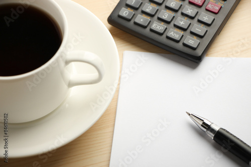 White paper calculator and coffee