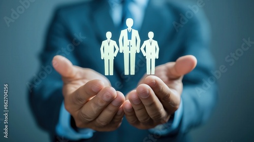 White paper human floating on businessman hands palm represents teamwork teambuilding good relationship with colleague human resources simple grey background