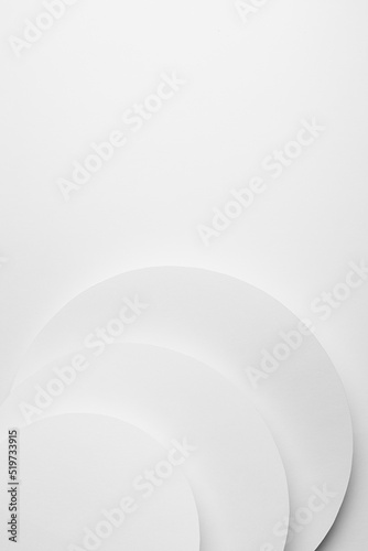 White paper round surfaces fly as soft light abstract geometric background with copy space in gentle elegant minimal style for business card, poster, flyer, text, top view, vertical.