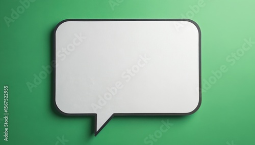 White paper speech bubble on bright green background. Simple geometric shape, clean design represents communication, messaging, placeholder for text. Suitable for social media, web design, business