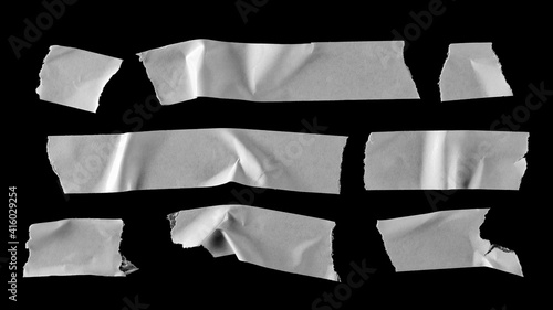 White paper tape pieces set and collection isolated on black background with clipping path, top view