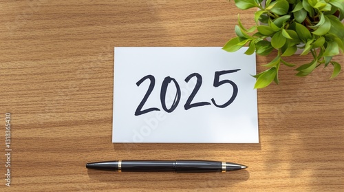 White paper with 2025 written in bold, placed on a wooden surface, next to a pen and small green plant. Concept of planning and future goals. Ai generative