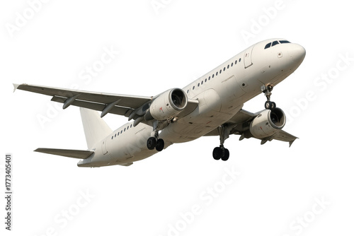 White passenger airplane in flight. Aircraft traveling for business or vacation trips. Transparent background provided
