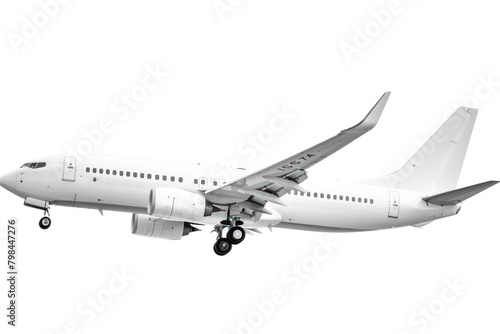 White passenger plane flying in the sky with dramatic clouds in the background, isolated on white background.