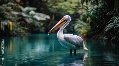 White pelican stands gracefully in a serene tropical landscape with lush greenery and calm waters
