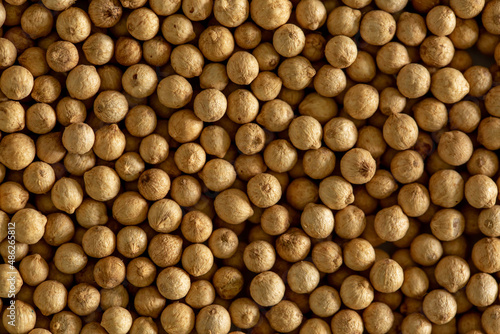 White pepper whole peas close-up as a background. Spices of Cambodia. Seasoning for dishes. Additive ingredient for the preparation of delicious delicacies.