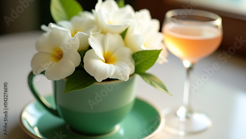 White petal flowers sit in a green cup with a green leaf on a flat surface with a romantic drink nearby._00002_