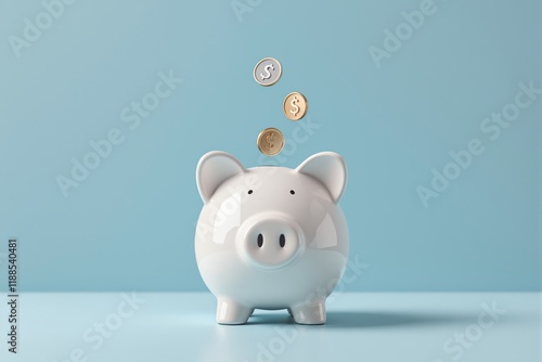 White piggy bank with coins falling into it on a simple light blue background. Symbolizing saving money, finances, and economic security