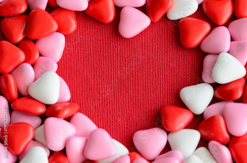 White, pink and red heart shape candies make big red heart background with copy space. Saint Valentines Day celebration concept.