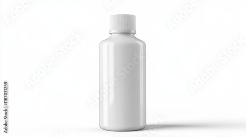 White plastic bottle, minimalist design, plain packaging, pharmaceutical style, studio lighting, soft shadows, clean background, product photography, matte finish, cylindrical shape, medical aesthetic