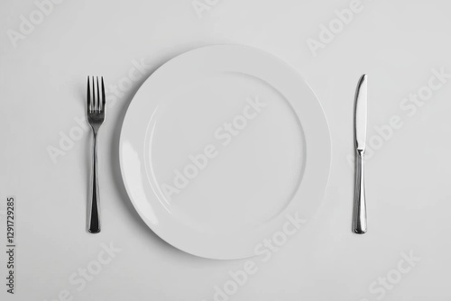 White plate with fork and knife isolated on a white background, top view, flat lay. A simple, clean, minimalistic background concept of dinnertime or food service. Copy space available. High-quality,