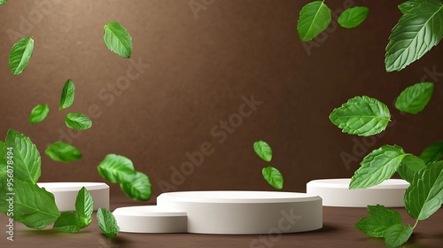 White Podium with Falling Green Leaves and a Brown Background