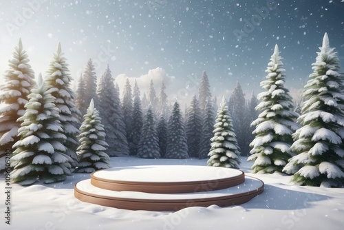 White podium with fir trees and falling snow. Display for winter holidays, New Year and Christmas product presentation