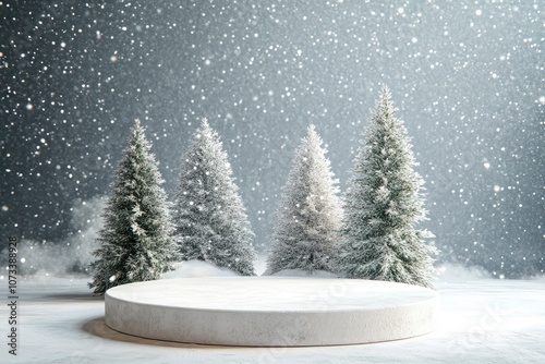 White podium with fir trees and falling snow. Display for winter holidays, New Year and Christmas product presentation with generative ai