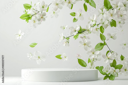 White podium with floral blooms and leaves against a bright backdrop space