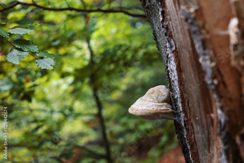 White polypore mushrooms on the old tree, yellow foliage, autumn mood