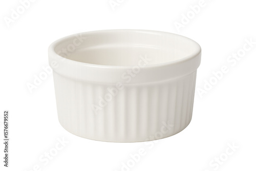White porcelain ramekin sitting empty, highlighting sleek ceramic surface against transparent backdrop, perfect for kitchen preparation