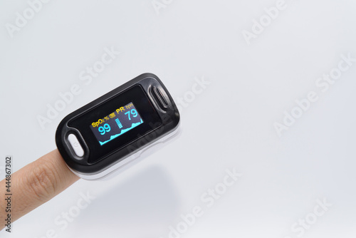 White portable fingertip pulse oximeter with multi-colored display isolated on white background. To measure SPO2 and Pr Values at home..