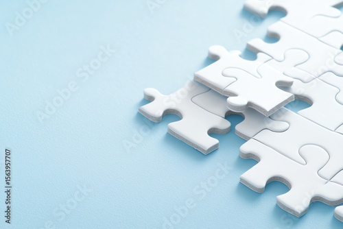 White puzzle pieces on blue background create serene and calming atmosphere, inviting creativity and problem solving. close up view highlights smooth texture and clean lines of pieces