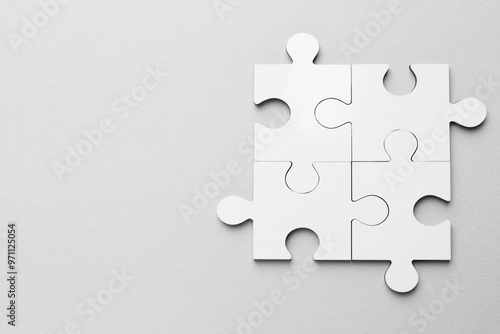 White puzzle pieces on grey background, top view. Space for text