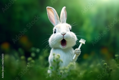 White rabbit on a background of green grass with a toothbrush in its paw. Background with copy space.