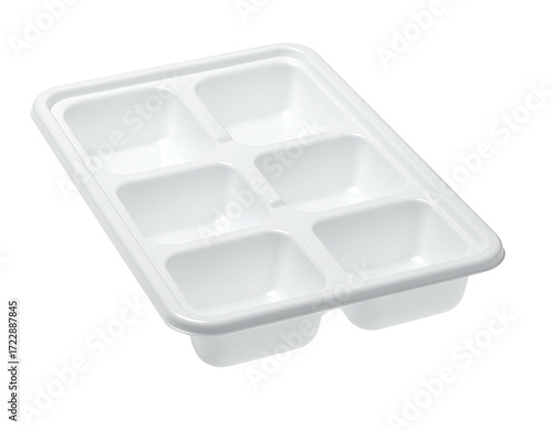 White rectangular plastic tray with six square compartments, slightly raised edges, and a matte finish