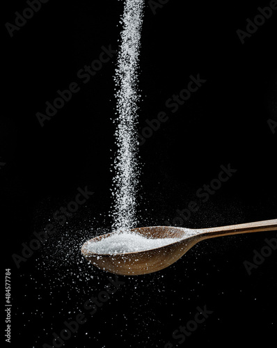 White refined sugar crystals falling down into the wooden spoon at black background.