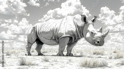 White Rhino Illustration Standing in Grass and Cloudy Sky