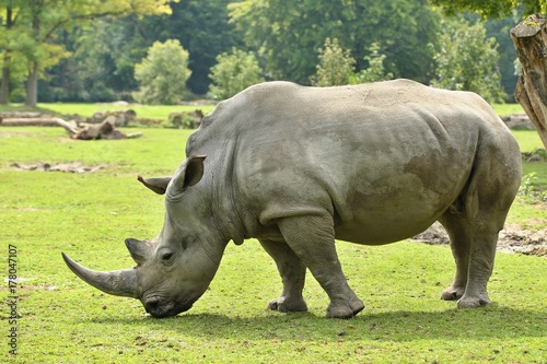 White rhinoceros in the beautiful nature looking habitat. Wild animals in captivity. European zoos. Prehistoric and endangered species in zoo.