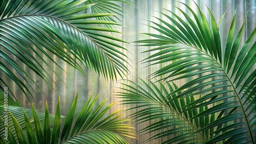 White Ribbed Background. Green palm with reeded glass. Plant texture for magazine. Natural wood and palm tree. Sunny window with bokeh.