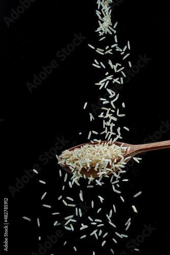 White rice grains falling down into the spoon at black background. Popular food and main ingredient of risotto and pilau.