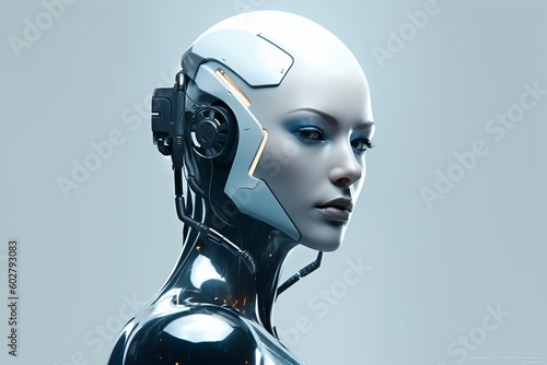 White robot with a smooth and polished exterior stands in the center of the image. Its blue eyes are the focal point of the image, reflecting a sense of intelligence and awareness. Generative AI