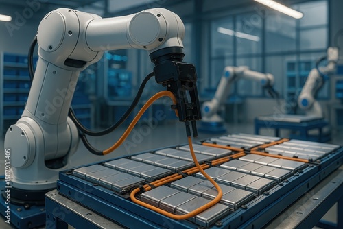 White Robotic Arm Assembling Battery Cells in Modern Factory