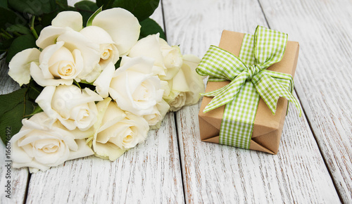 White roses and gift box