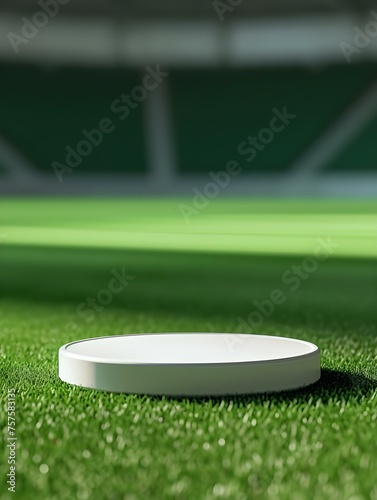 White round Platform for Product Presentation on a green Pitch. Blurred Sports Background