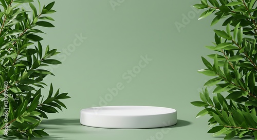 White round template podium mockup natural organic cosmetic product presentation advertisement with green fresh leaves nature frame flat lay background trendy stylish minimalist flatlay backdrop.
