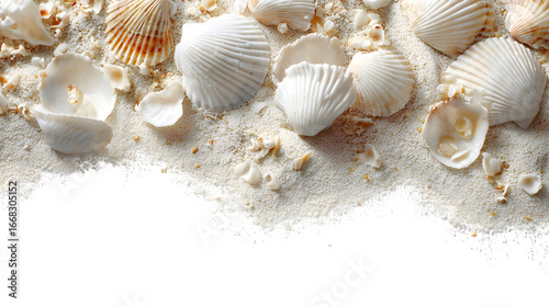 White seashells are scattered across smooth sand