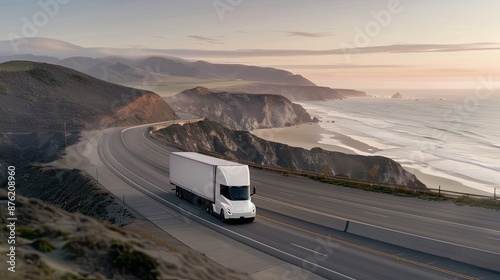 White Semi-Truck Travels Coastal Highway at Sunset