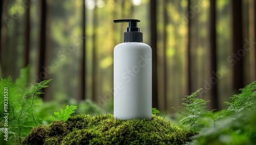 White Shampoo Bottle with Black Pump on Moss, Surrounded by Green Plants and Dark Background