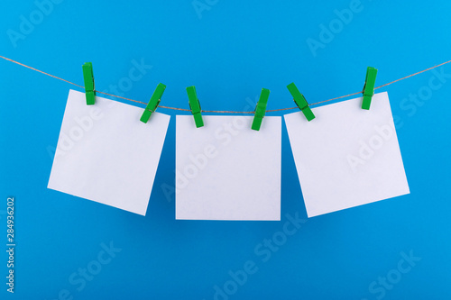 white sheets of notepad for notes and reminders, fastened with decorative green clothespins, hang on a rope on a blue background