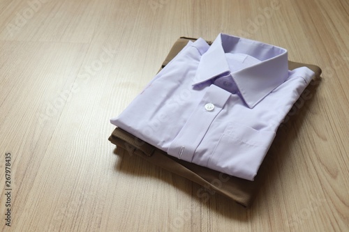 white shirt and brown pants lay on the wooden floor