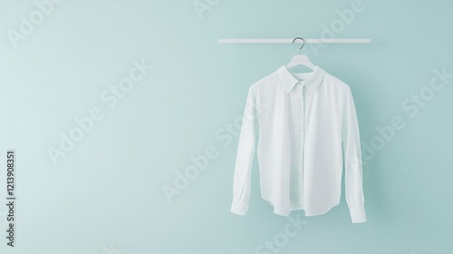 White shirt hanging, minimalist blue wall, clothing display, apparel mockup