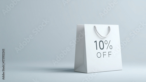 White shopping bag displaying a 10% off sign, symbolizing retail sale, consumer discount, and promotional offers