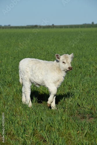 White Shorthorn calf , in Argentine countryside, La Pampa province, Patagonia, Argentina.