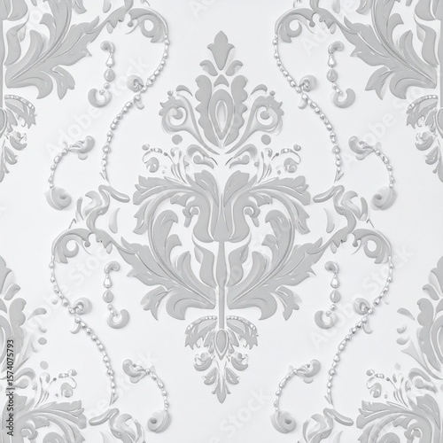 White Silk Fabric Texture with Silver Gray Damask Pattern