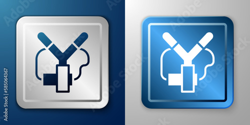 White Slingshot icon isolated on blue and grey background. Silver and blue square button. Vector