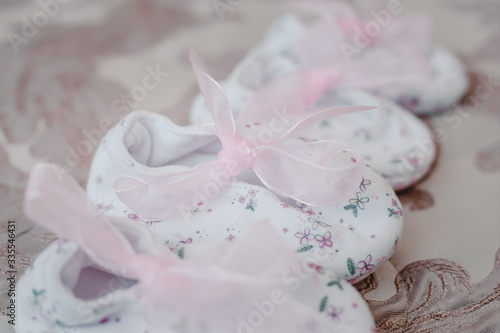 white slippers for a newborn with pink bows