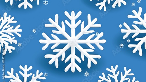 White snowflakes float on a blue backdrop, creating a winter holiday scene, ideal for design