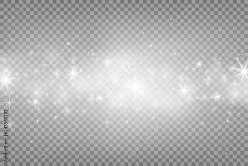 White sparks and silver shiny stars with light effect. Magic dust particles. Vector sparkles effect on transparent background. Christmas and New year abstract pattern. Vector illustration