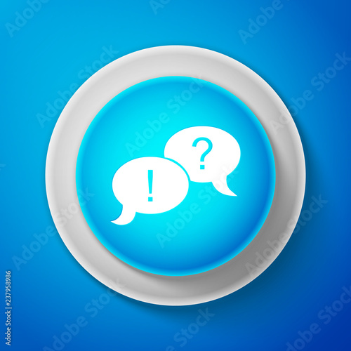 White Speech bubbles with Question and Exclamation marks icon isolated on blue background. Circle blue button with white line. Vector illustration